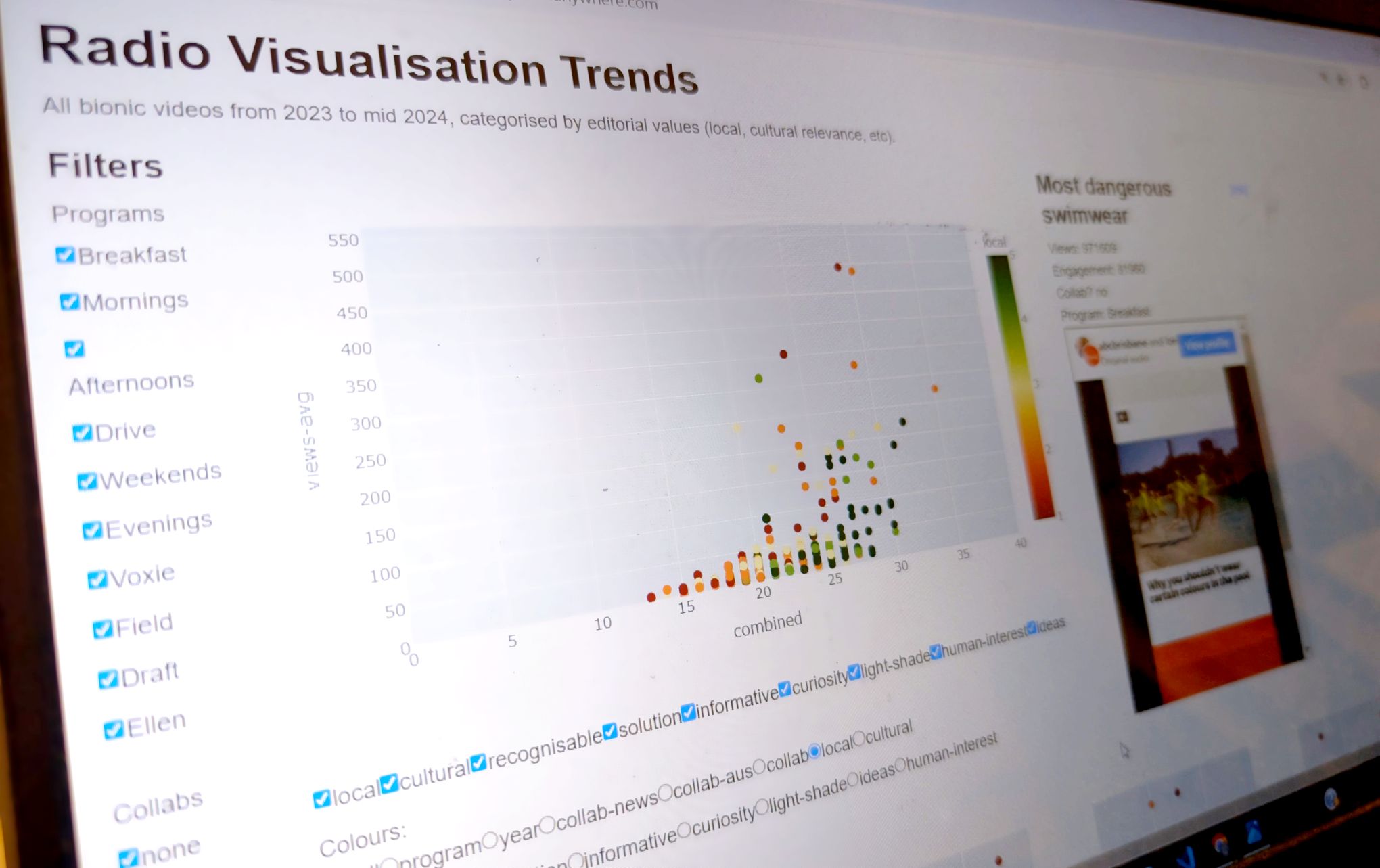 The aim was to identify the "editorial values" that most accurately predicted the perfomance of our videos on social media, such as localness, curiosity, light/shade, human interest, etc. The result was this interactive dashboard and a refined content selection process that successfully tripled our output from 3 million views in six months to 9 million views in the next six months.